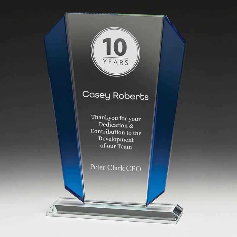 Substantial glass award with a strong design and ample space for personalisation. Clear glass is framed expertly by blue glass wings. Supplied in gift box.